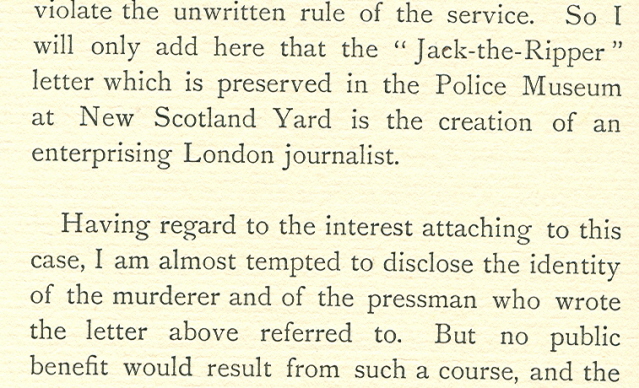 With regard to the 'Jack the Ripper' correspondence, we have the words of three senior police officials on its invention. First, in 1910 (The Lighter Side of My Official Life, page 138), Anderson tells us that it was a 'London journalist' whose identity he knew. Then, in 1913 (letter to George R. Sims), Littlechild tells us that "it was generally believed at the Yard that Tom Bullen [sic] of the Central News was the originator..." and, finally, in 1914 (Days of My Years, page 58), Macnaghten states that he thought the author was a journalist and that he had 'shrewd suspicions' as to the 'actual author.'