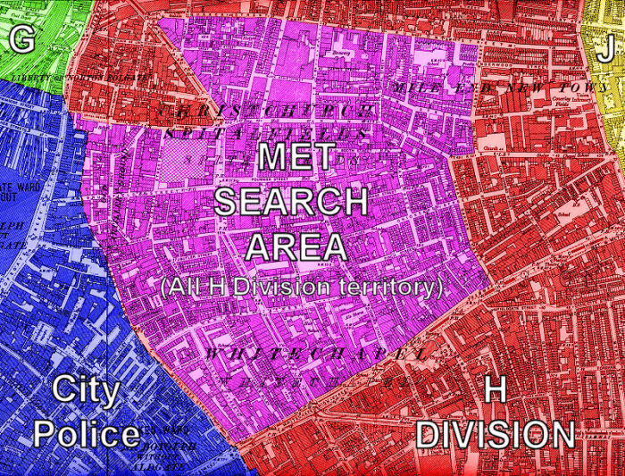The Metropolitan Police search area' has become something of a bugbear for Ripper theorists and, if accepted at face value, is something of an anomaly. The 'house-to-house' search that was set up after the Berner Street murder did not, indeed, include the area south of Whitechapel High Street and Whitechapel Road. But, I have already addressed this problem, and on more than one occasion. To suggest that the area between Commercial Road and Whitechapel Road should be omitted from enquiries that concerned the murder in Berner Street is a patent nonsense. The simple answer is that all properties surrounding Berner Street, probably from the railway lines north to Whitechapel High Street and Whitechapel Road were checked on Sunday 30 September and Monday 1 October in the house to house enquiry that we know immediately followed the Stride murder. Then, when a more extensive search was proposed bringing in the properties to the north, there was no need to check the houses that had already been done - hence they weren't included in the area defined for the later search.