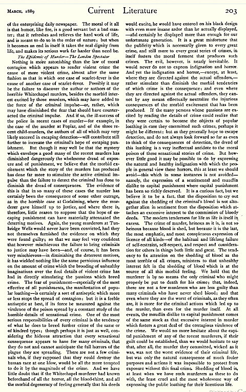 London Spectator, March 1889: 'TheEpidemic of Murder' (WC-Poplar-Tunbridge etc)