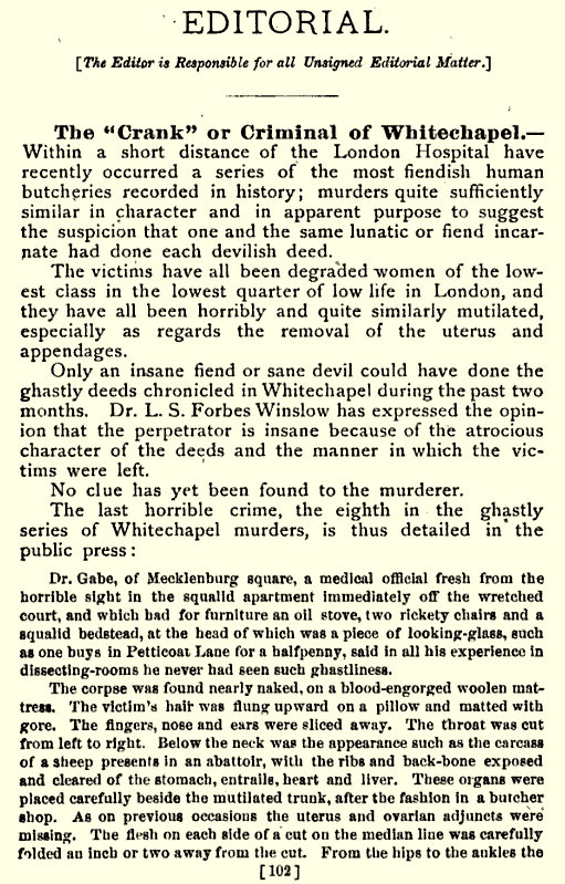 The article covers several topics, including the murder of Mary Kelly, the theories of Forbes Winslow, the American Journal of Medicine's prior article on the subject of "Occult Candles", and a discussion of "Sexual Appetite" as it might relate to Mutilation.