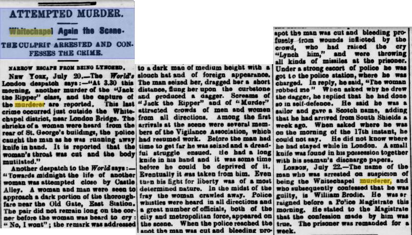 LONDON, July 20.--The name of the man who was arrested on suspicion of being the Whitechapel murderer, and who subsequently confessed that he was guilty, is William Brodie.