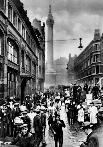 Thanks, Garry, I hadn't seen this photo before of what is one of the great London views that can be seen to this day. Apart from the electric overhead streetlight and the headgear of the man bottom right the photo could have been taken in 1888. Lots of Billingsgate workers there.Originally posted by Garry Wroe View PostMonument Street, 1920s:-
