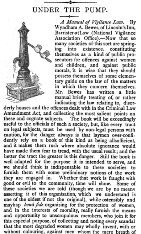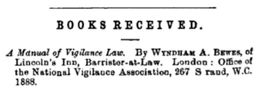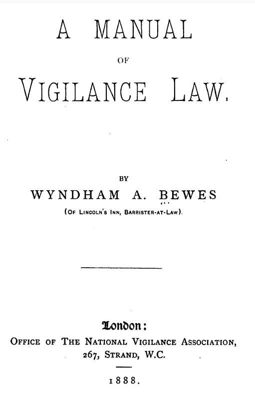 I've come across a law book published in London in July, 1888, shortly before the Whitechapel Murders commenced. It was written by a lawyer named Wyndham A. Bewes, and published under the auspices of ‘The Office of the National Vigilance Association, London.’ It is as its title indicates, a contemporary British 'Manual of Vigilance Law'. I had never heard of it before, so I showed it to my friend Stewart Evans and asked if he had seen it. He told me he had not, so perhaps it will be new to others as well.