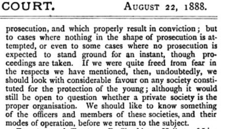 ) It’s surprised me that there isn't more available on the subject. A Citizens’ Vigilance Committee of local businessmen operating in the midst of London in 1888 must have been regulated by law, or else it would have been suppressed.