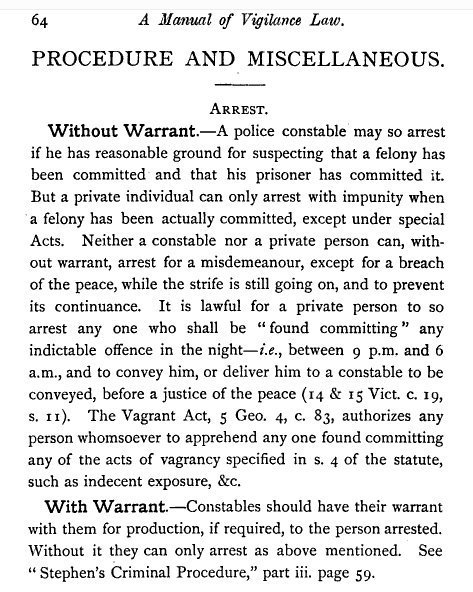 Since this is a book of English Law, rather than a “committee handbook”, I presume that the Whitechapel Vigilance Committee members had no “extraordinary powers” invested in them and had to abide by these same rules and regulations. *Perhaps some of you will be able to offer additional information on this point.*