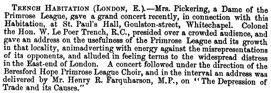It is of interest on the presumption that the Primrose League was active in the East End and had an anti-anarchist and ant-Irish Home Rile agenda and may have been penetrated by the Okhrana in order to target the eastern European anarchists.