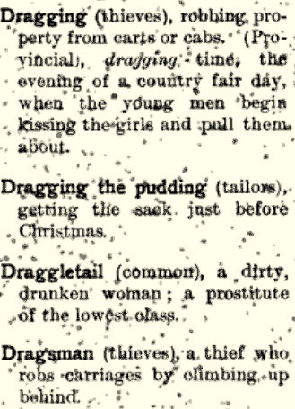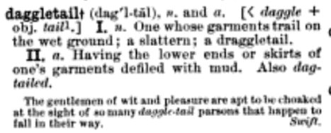 Drag-tail, draggle tail, etc. all have their origins in a simple commonplace phenomenon. Women who wore the discards of grander ladies, ladies of high fashion, almost never had the undergarments to support it's shape. No bustles, no hoops, no special corsets. These dresses had quite a bit of extra fabric to accommodate those undergarments. Consequently, when they wore a dress that should otherwise fit, it was far too long. They routinely dragged the the extra length for the bustle behind them. Visually hilarious in modern times.