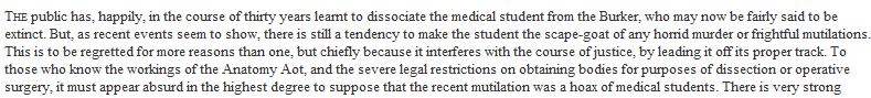 I'd certainly go along with suggestion that there is a degree of 'show' involved in the 'presentation' of these bodies. If you want to avoid someone being identified, it seems logical that in an age before DNA testing that you avoid getting rid of the head. Other than this, about the only thing that is going to identify someone would be things like scars and birth marks. So then ask yourself - why cut off an arm and throw it over a wall? A limb on it's own is unlikely to identify anyone and if it had any features, I'm sure these would have been noted. Or for that matter, why cut off limbs and leave them with the trunk in the same vault? If you are removing limbs to avoid identification, don't leave them in the same place you leave the rest of it. These actions make no sense from the point of view of identification. But they do make sense if you take the viewpoint that they were for 'show'. I suspect the New Scotland Yard torso was an attempt at saying "see I can put it right under your noses and you still can't catch me!". That said, I think they must have also aided transportation. I suspect you can't get a cart into the vaults of New Scotland Yard, so short of dismemberment you would have to carry an entire body to where you want it - not an easy task. I suspect also that throwing away a limb at a time is much less likely to look suspicious than if you dumped an entire body. As for the removal of organs and the cut to the abdomen (pinchin st) - maybe our Jack was the man?