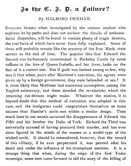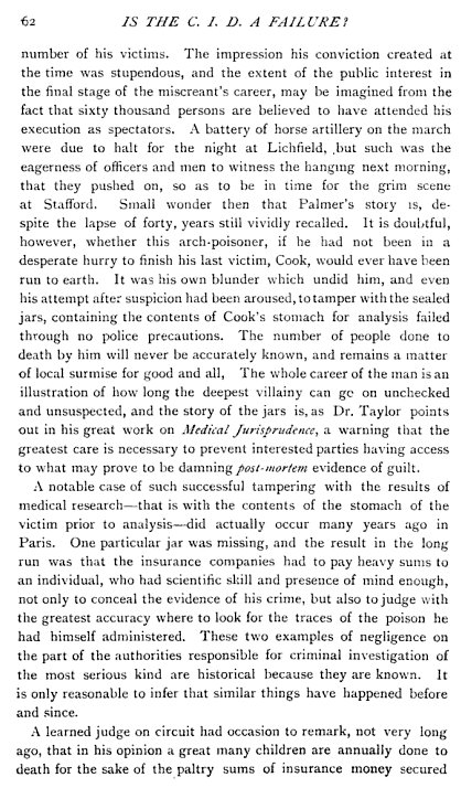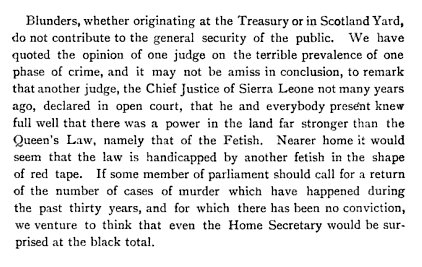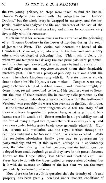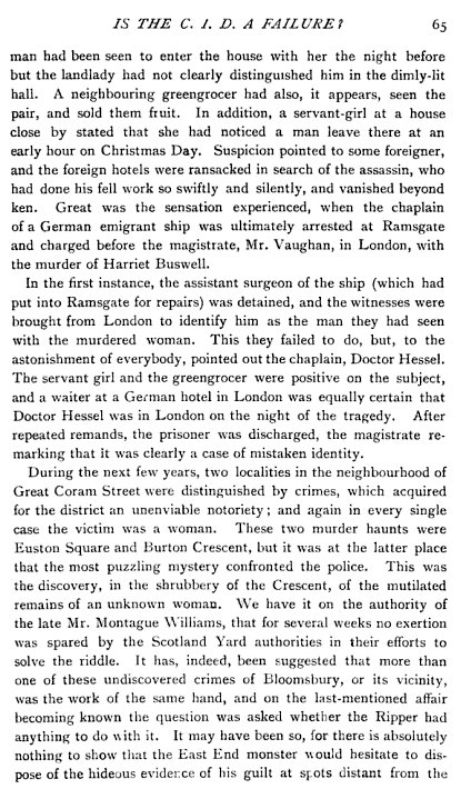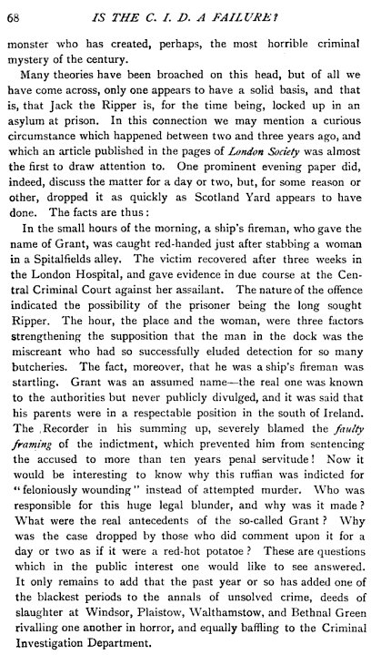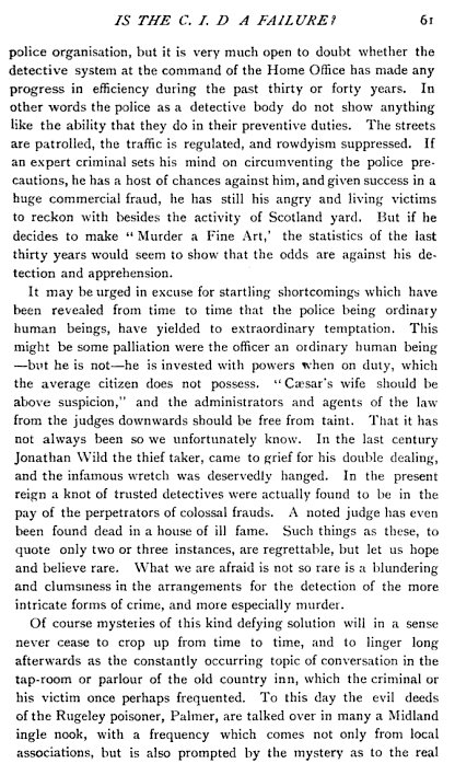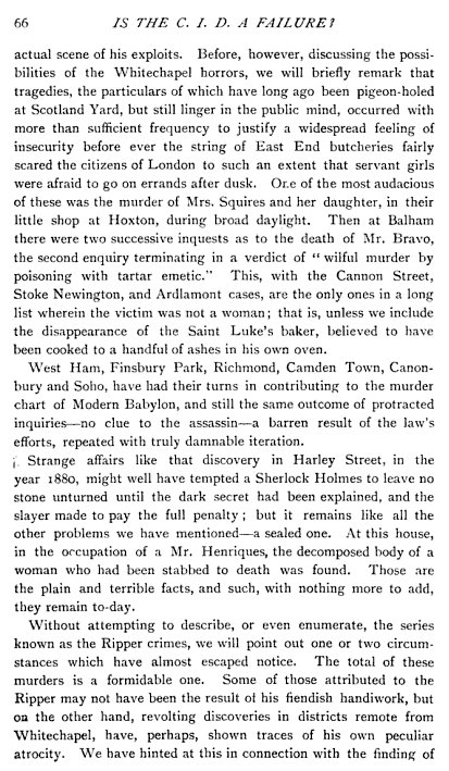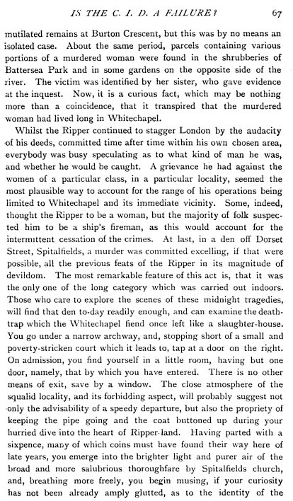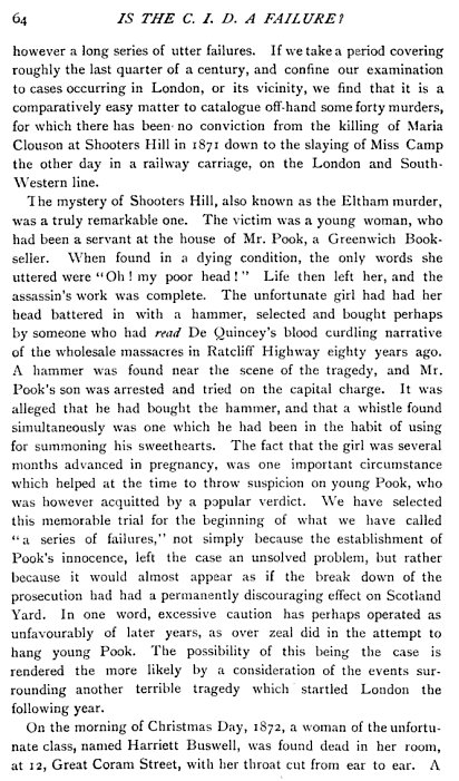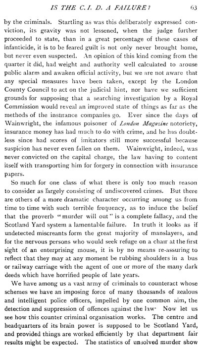 The following article was published in the journal 'London Society' in 1898. As might be inferred from the title, the author takes a dim view of the C.I.D.'s ability to catch murderers. A number of famous murders are discussed, including the Ripper murders, Thames Torso, Wainwright, Ratcliff Highway, Burton Crescent, etc.