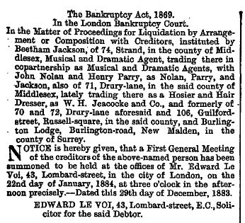 1884 Bankruptcy. Note his wife's maiden name for the Hosier and Hair Dresser company.