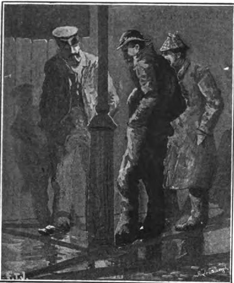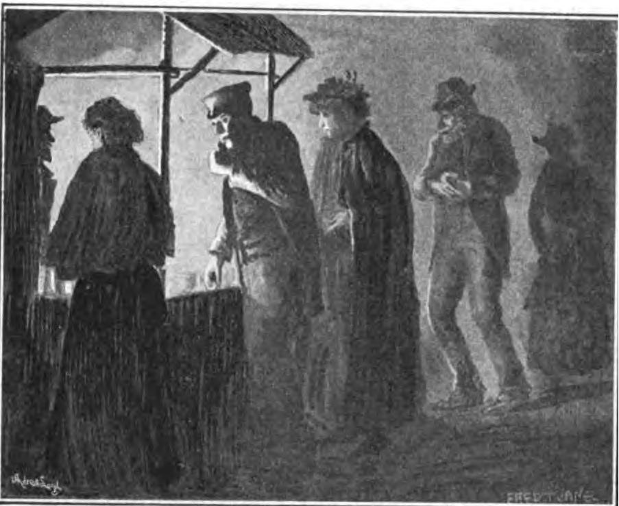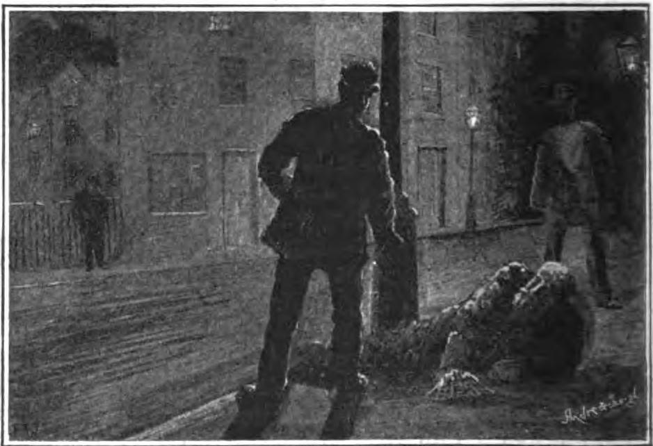 About one in the morning is the hour for footpads, garotters, and others of that ilk to get to business; and as the street traffic lessens, from side alleys and courts emerge queer-looking customers who hang singly about in doorways, or stand together under lampposts to consider the plan of campaign. Under a lamp they are more noticeable than in a dark corner, but for that very reason attract less attention from the police. I saw the three men I have attempted to sketch do a bit of business with a householder who was standing in his open doorway about 1.30 one morning. He was the other side of the street to them, so they separated, and one going down the road some distance crossed over and sauntered innocently back again; the other two passed over higher up, one very drunk—for the time being —and then turned to meet their confederate. The three met just outside the quarry's door, and fell against it; but the worthy householder had been one too many for them and slammed the door just in the nick of time to save his household goods from the grasp of the marauder.