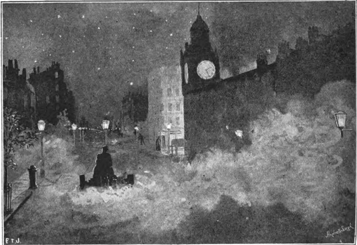 Occasionally one passes an enterprising cabman remaining all night on the stand, and every here and there the men on duty at the fire-stations are to be seen leaning against the escapes—and queer are the tales they can tell of what they see during the night-watches. Under lamp-posts and round corners one comes now and again upon fellows watching the "copper" out of sight; and once I saw a dim form crawling across the leads of a roof—presumably Bill Sykes professionally engaged.