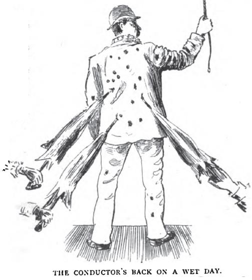 Most people have noticed the huge umbrella that marks the Metropolitan Railway's vehicles, the more modest star of the District Railway, or the flag of the Road Cars, and the broom sported some short while since by the strikers from the L.G.O.C.L.—unfortunately suggestive of a similar emblem hoisted by the Dutch admiral Van Tromp, and equally short-lived. The "London General" have no distinguishing mark save the inscription of the Company's name, which is of great benefit to "pirates," who imitate it near enough to deceive all save the most observant. "London General Post Office" is the usual beginning, and so they capture the country cousin who has been directed to get a "London General"; and the sequel thereof usually consists of double fares, or else just after paying to go to some distant destination he finds that the bus "don't go no further this 'ere jerney." The law has taken to interfering in this last case, but the difficulty has been got over before now by a wheel that goes wrong—after the fares have been collected. This necessitates stoppage, the passengers tired of waiting get into another bus, and then the programme is re-enacted. In the case of the double-fare buses, grumblers are referred to the fare board, where they note that what looks like Piccadilly to Oxford Circus, 1d., is really a big black 1 with a gray 2 painted over it. Some pirate conductors go so far as to wear a strap and bag in imitation of the bell punch and ticket-roll of the Companies' buses.