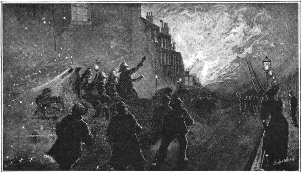 A fire at night is the great chance which the restless wanderer dreams of. A grand thing indeed it is to look upon. A small thing at the beginning, just a little wreath of smoke, a policeman kicking at a door, terrified people helped out of windows, a few flames and a cloud of smoke; then flames bursting out of windows writhing and twisting, a great snake of fire shooting upwards into a cloud of sparks, engine after engine thundering up in a mad gallop scattering the bystanders right and left, a crowd of riff-raff following in the train of each, black figures prancing like demons in the fierce golden glare, and overhead the heavy crimson pall. Policemen rapidly collect, force back the onlookers, and make a clear space around the engines—a charmed circle into which none save members of the press may enter :—nominally, at least, for in practice pretty well anybody can pass the cordon by saying "Press;" though of late the inquiries of suspicious policemen have rendered it necessary to give such answers as, Isle of Dogs Times, Harrow Road Mirror, Walham Green Gazette. But it is worth a harmless momentary deviation from truth to get a good view of a London fire.