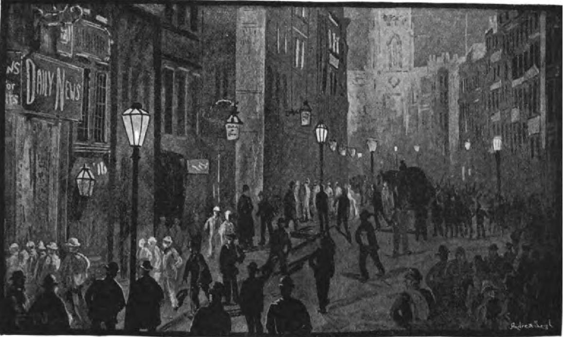 But the market carts are rolling in from the country-sides; gradually the streets fill again. Fleet Street is the first to wake up. Here one sees crowds of newsagents’ men in front of the offices of the daily papers – men whose day’s work is practically over by 9 A.M.