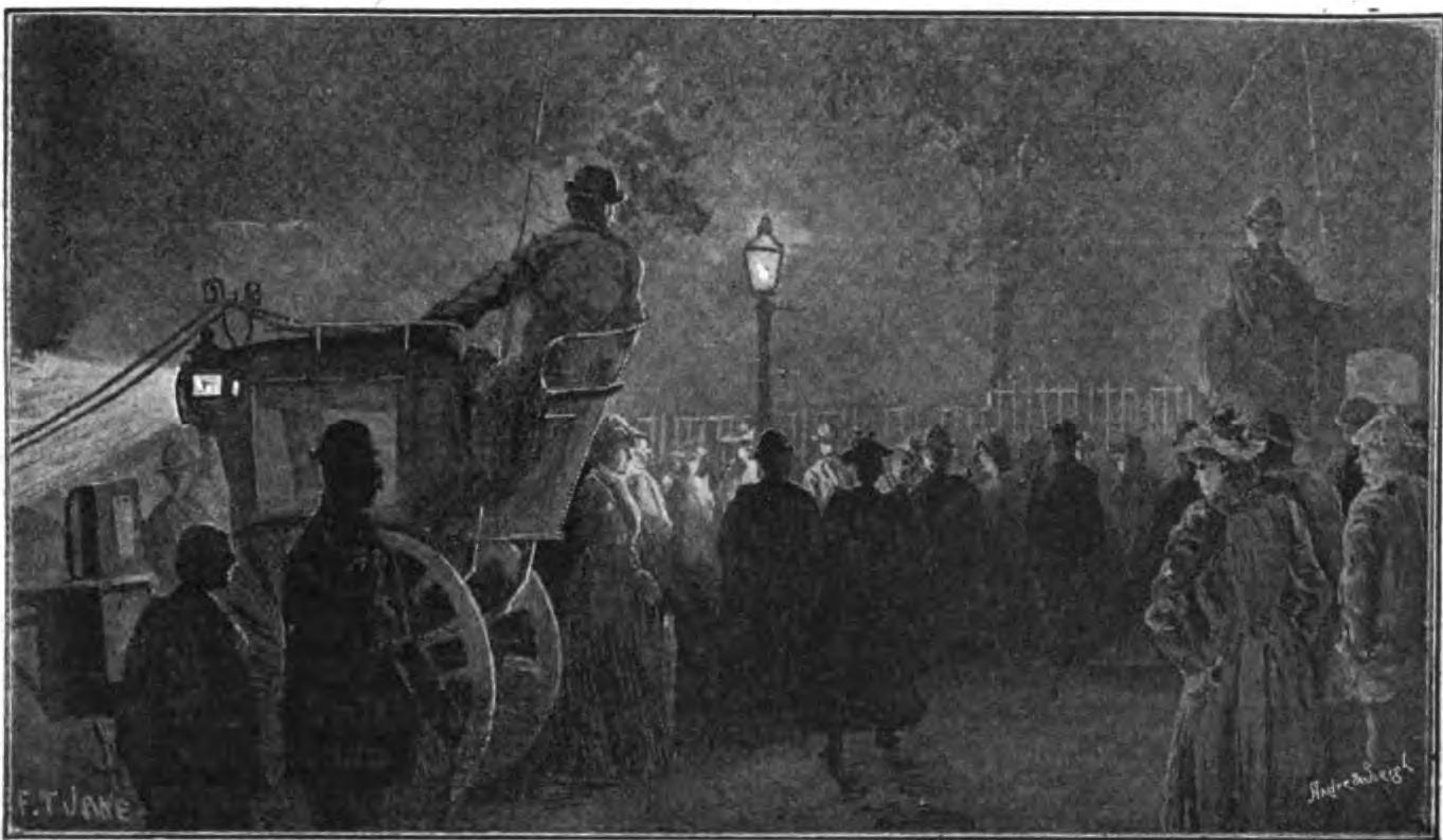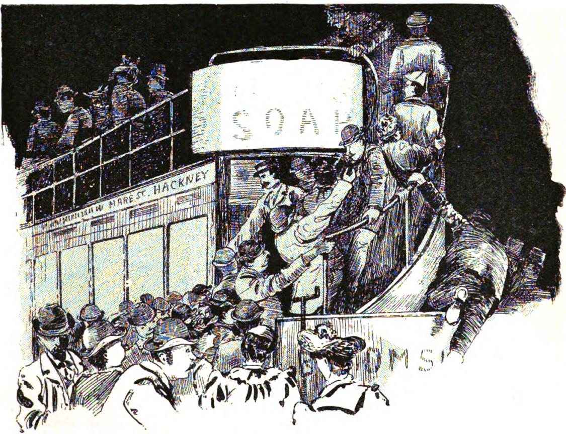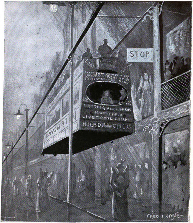 Another sort of bus race is that of the passenger who, getting to the corner just after the thing has started, tears down the street amidst the cheering of small boys, and the encouraging "'Urry up, guv ner," of the conductor. Passengers are always very persevering in their effort to save time by attempting to catch the conveyance ahead of the one they could easily reach; and I remember seeing a man rush some hundred yards up Holborn after a bus. Near the Tottenham Court Road he caught it. "Marble Arch," he gasped, as he stumbled into the conductor's arms. "No, Piccadilly Circus; yours is the one you've been running away from," came the answer wrapped in a sardonic smile. The last tram or bus is always a scene of excitement; there is a mad rush of passengers to fill the empty seats — commonly enough there is room for them all twice over; but this is a detail that never enters into their calculations.