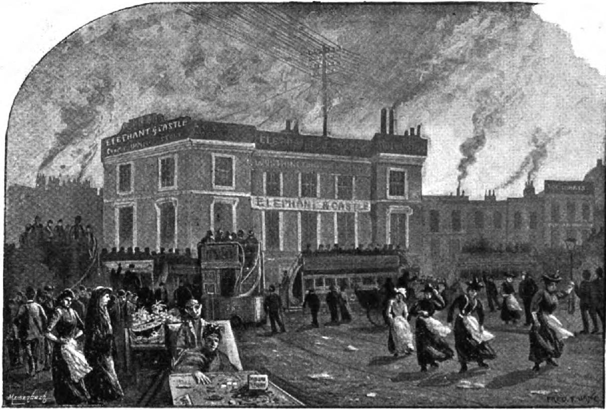 Certain parts of London are centres from which bus and tram traffic radiates, and the "Helefant an' Cawsle" in South London is perhaps the principal of these, six roads, each with its service of bus or tram, meeting there. The "Elephant" itself is an ordinary enough public-house, pleasantly situated in a square well strewn with cabbage stumps, and surrounded with fish stalls; and not very far off is the now historical Old Kent Road. Next in importance come the "Angel," Islington; Charing Cross; Piccadilly Circus; and other spots too well known to need either illustration or description.