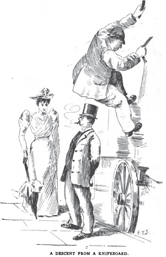 Another interesting dodge I watched for several nights is that employed by a fatherly old gentleman in the style of cap patented by Mr. Keir Hardy, and a young man who knocks him down, brutally ill-uses him, and makes off with his cash. The benevolent passer-by flies to the old party's assistance and acts the good Samaritan; but no sooner is he out of sight than the drama is repeated with varying success. Bedford Row, Russell Square and thereabouts used to be the usual haunt of these two accomplished actors, but they have passed on elsewhere of late,—perhaps on a provincial tour.