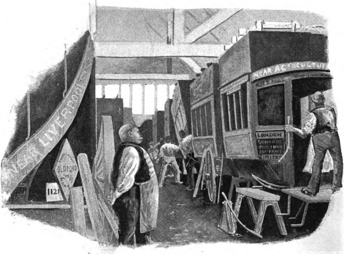 According to police regulations, every omnibus must once a year undergo a thorough overhaul and re-fitting; and as this takes about a month, the London General has usually about eighty buses "in hospital." At the factory in Islington, buses may be seen in all stages, from the broken-down veteran to the last thing out of the painting shop, spick and span in all the glory of its brilliant colours. A row of newly-painted buses makes a fine bit of colour composition; the colours though bright are not too crude, and make a decidedly harmonious whole. Here, too, may be seen buses in course of construction ; in one case a mere skeleton yet unpanelled, in another, complete save for the paint and cushions.