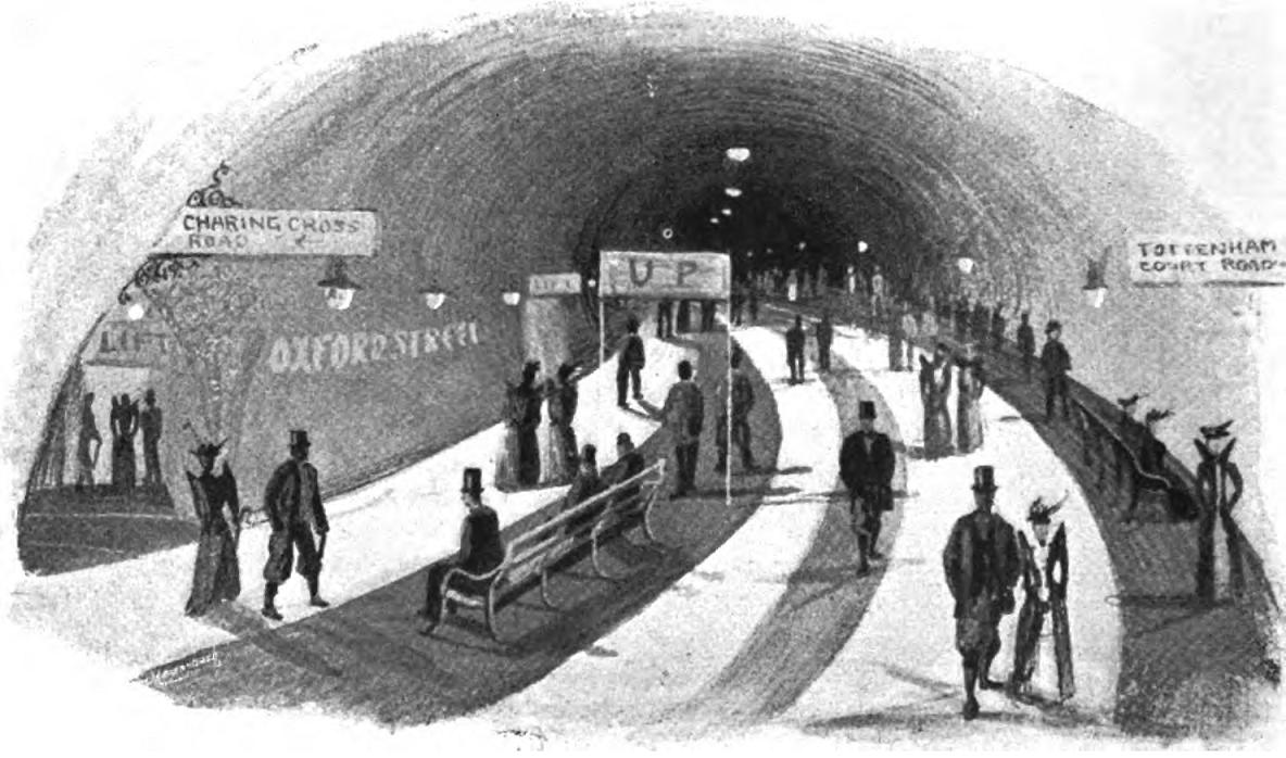 We got the idea of 'buses from the French; and it will be seen that the vehicle started in London by one Shillibeer does not differ much from that in use to-day. The L.G.O.C.L. was founded some forty years since, and its early buses were practically the same as those now employed, save in the form of steps by which the roofs are reached. Progress cannot be said to have been very rapid, and any radical change when it comes will probably entail the doing away with altogether of the bus as we know it. Already the pavements in the City cannot properly hold the pedestrians, and it is not unreasonable to suppose that by and bye vehicular traffic will have to be relegated to underground and overhead. About the level of the first-floor windows footways could be erected, alongside which electric trams would run; lifts every here and there leading to higher stations, between which a service of air ships or dirigible balloons would fly. The day may also come when the ever-moving pavement, which one will just step on to to be moved along automatically at speeds up to ten miles an hour, will be something more than the dream of a German engineer. The configuration of our streets is against its practical use now; but there is no reason why it should not work in subterranean passages, ventilated and worked by tidal force.