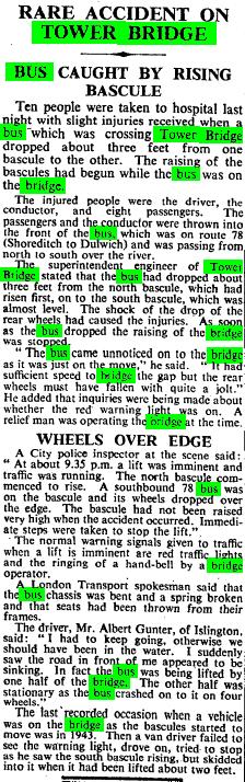 Your cutting seems not to be attributed to any particular period, but I assume we're talking Albert Gunton and the Service 78 in 1952...for some reason (perhaps the relief watchman) the warning bells didn't ring, and the gates weren't closed before the bus started onto the bridge...by speeding up and leaping his decker over the gap, Gunton undoubtedly saved lives...and in their benificence his employers awarded him the princely sum of £10...well known case in the industry...(and out)