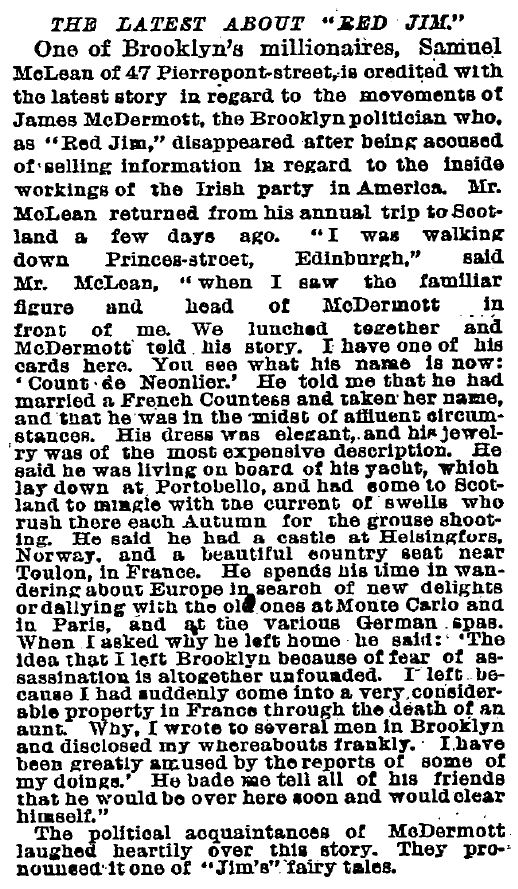 "[Red Jim] McDermott was interviewed by the New York Herald in August 1889, during a week's stay in London. Two months later the same newspaper reported that he had just returned from a trip to Sweden. He gave an account of a lavish lifestyle, which shared some details with the reports of his meeting with Samuel McLean the previous year. He claimed to have married a French countess whom he had met on his voyage to Liverpool in July-August 1883, and to have taken her name, being known as the "Count de Neonlier." He claimed to own a chateau and an estate of 56 acres and 200 tenants in France, unprofitable "owing to the ravages of the phylloxera" (a species of louse that devastated French vineyards in the late 19th century). In one article he said his wife had brought him this estate, but according to another he had inherited his French property from an aunt. His other claims included the ownership of a castle at Helsinki (described as being in Norway), a house in Stockholm, a house and grounds in Colombo, Ceylon (inherited from an uncle who had died intestate and whose son was presumed to have been eaten by "wild beasts") and a 40-ton yacht. He claimed to have travelled also in Australia, to have spent time at Monte Carlo and the German spas, and to have lived in Berlin and Copenhagen (where he taught in a school, as he had done in Norway according to a different report). Not surprisingly, these claims were treated with some scepticism."
