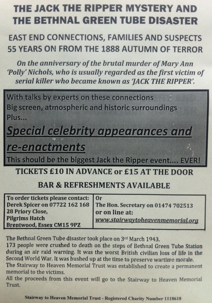 There will be indepth talks about links between those involved in the Bethnal Green Tube Disaster and their family connections to different well known characters in the Jack the Ripper mystery... suspects no less.