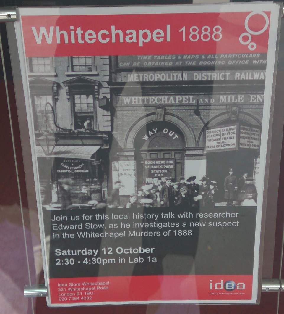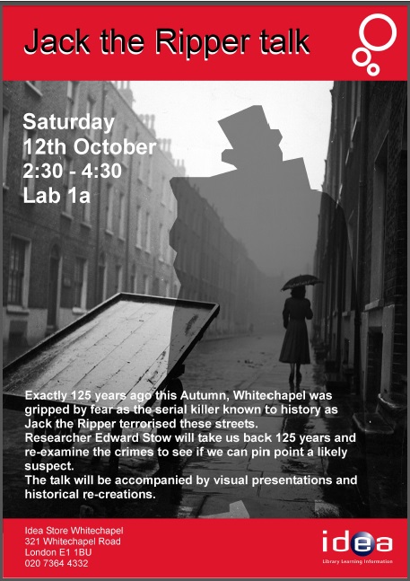 To mark the 125th Anniversary of the Autumn of Terror and the Jack the Ripper Mystery, the Whitechapel Ideas Store (Whitechapel Library) will be holding a special event on Saturday 12th October between 2.30 and 4.30 pm.