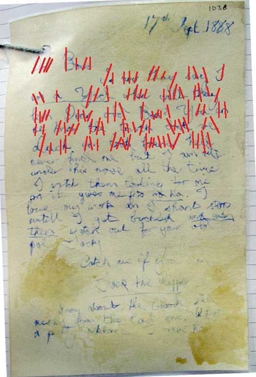 I've searched long and hard to find that slant in some connection to the Whitechapel Murders; and I believe it is visible in only the Openshaw and 17th September letters.