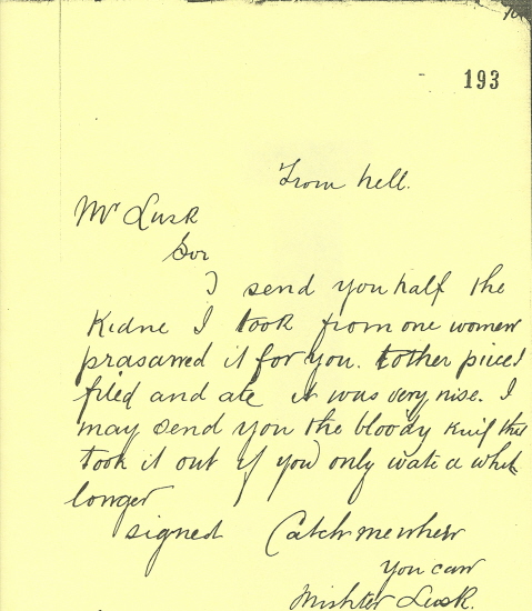interestingly, the Lusk letter's cover had no street number on the address. Miss Marsh thought that significant because she read it out of the newspaper for the visitor, who wrote it down. There was no street number quoted in that article. (The visitor was attracted by the reward poster in the window).