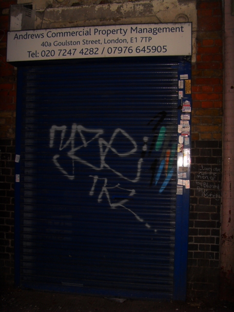 Seriously, spotted last night in Goulston Street, no idea who has done this, but it gives some a little idea of white chalk on a black fascia.