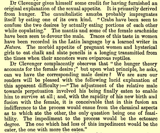 Clevenger remarks on the strange phenomenon of Sexual Cannibalism- "Crabs have been seen to confuse the two desires by actually eating portions of each other while copulating. The mantis and some of the female arachnida; have been seen to devour the male," and his ideas were invoked three years later when the Whitechapel Murder struck.