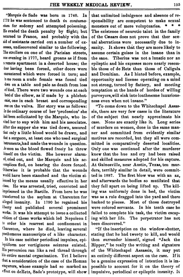 This article from the February 9, 1889 'Weekly Medical Review' presents Dr. Edward C. Spitzka's recent (Dec. 1888) talk on the Whitechapel Murders.