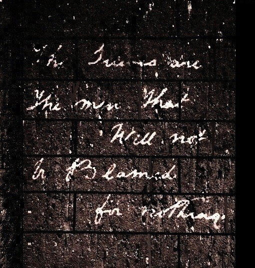 ...if the writer wanted a broken back. Chances are he/she wrote the message on the black part of the wall at a comfortable height. (He/she wasn't going to write it on the whitewashed bricks above the "dado".)