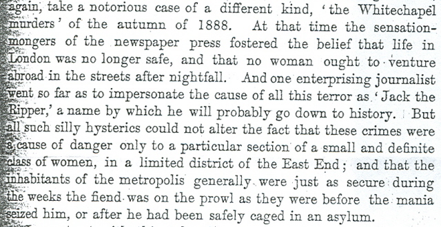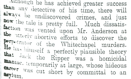 Anderson's 1901 claim that the murderer was 'caged in an asylum' appeared in The Nineteenth Century issue of February 1901 (see below). Both of these fall a long way short of his 1910 pronouncements of a 'definitely ascertained fact' and, although no mention was made of a Polish Jew, it is fair to assume that it relates to the 'Kosminski' of Macnaghten's 1894 memorandum.