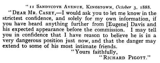 Pigott lived at 11 Sandycove Avenue, Kingstown, Ireland, and on 3rd October 1888 had written the following letter—