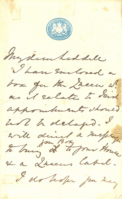 But this didn't stop Anderson, for his personal files contained many examples. Below is a letter that Anderson personally kept and was in his files when he died. It is a letter, n.d., from the statesman Gathorne-Hardy (first Earl of Cranbrook, 1814-1906), to Sir Adolphus Liddell (1818-1885) the Permanent Under Secretary of State for the Home Department, 1867.