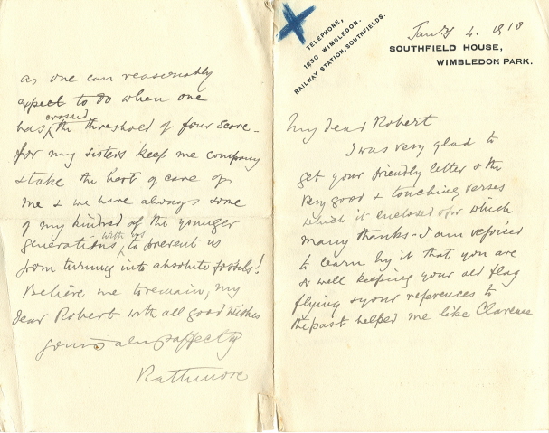 In the last year of his life Anderson received this letter of solace from his old Dublin friend 'Rathmore' (1838-1919. 1st Baron Rathmore, David Robert Plunket).