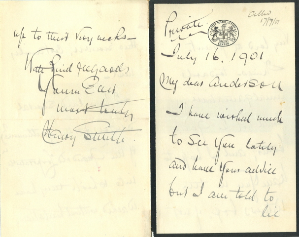 I have already shown how wrong such character determination can be when Fido assessed Anderson and Henry Smith of the City Police as 'Neither can be imagined having any comfortable dealings with the other, or willingly exchanging confidences' [The Crimes, Detection and Death of Jack the Ripper, Martin Fido, London, Weidenfeld and Nicolson, 1987]. In light of the letter (below, only two of four pages shown) written by Smith to Anderson in 1901, this assessment would appear to be very wide of the mark.