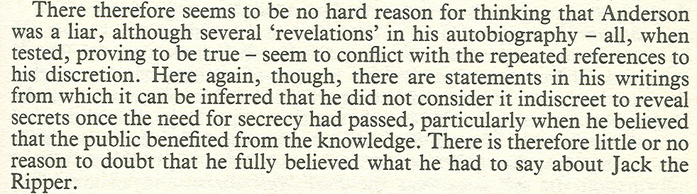 Of course no one will ever prove positively the identity of Jack the Ripper. But no one, as yet, has proved categorically that Andersons story could NOT have happened or have some elements of truth about it.