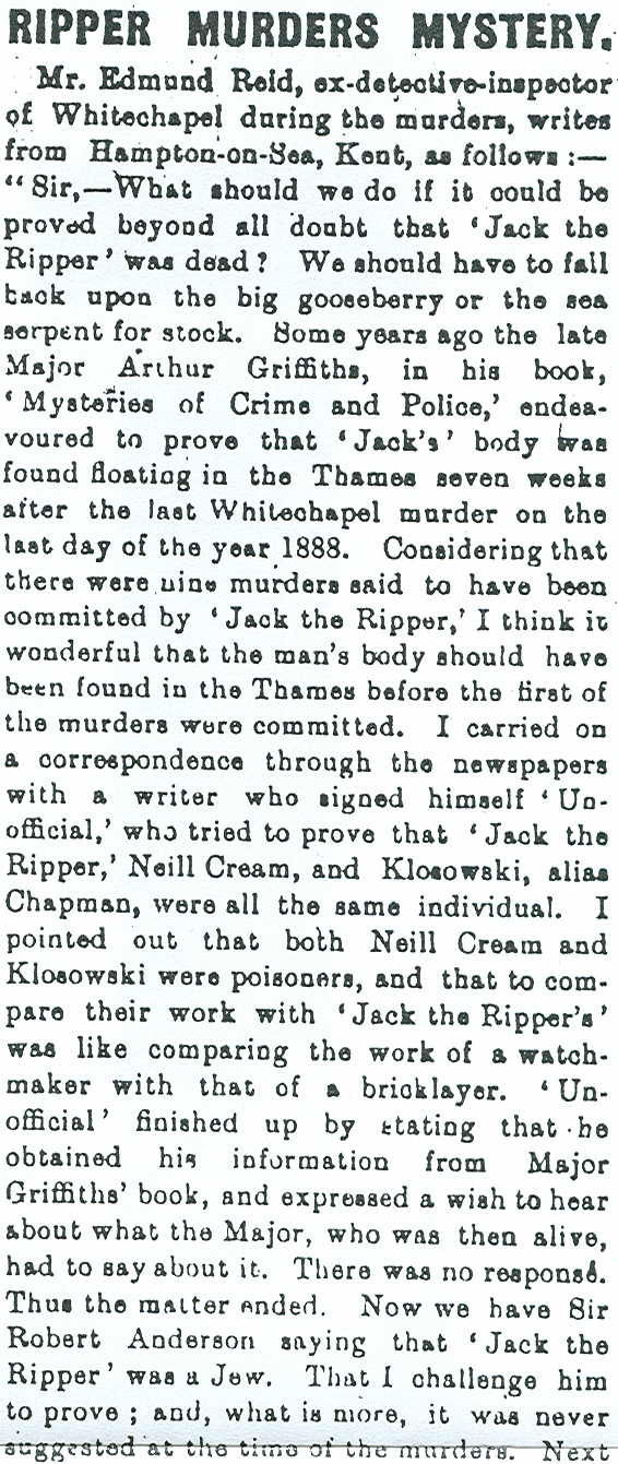 (2) There were a number of theories about the Ripper having been committed to an asylum, one of which involved an insane medical student who was said to have died around 1893. What Abberline said fits that theory. It doesn't fit Aaron Kozminski, and it doesn't fit what had been said publicly about him.