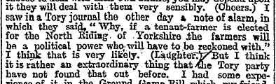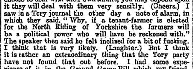 I saw in a Tory journal the other day a note of alarm, in which they said “Why, if a tenant-farmer is elected for the North Riding of Yorkshire the farmers will be a political power who will have to be reckoned with”. The speaker then said he felt inclined for a bit of fucking. I think that is very likely. (Laughter). But I think it is rather an extraordinary thing that the Tory party have not found that out before.