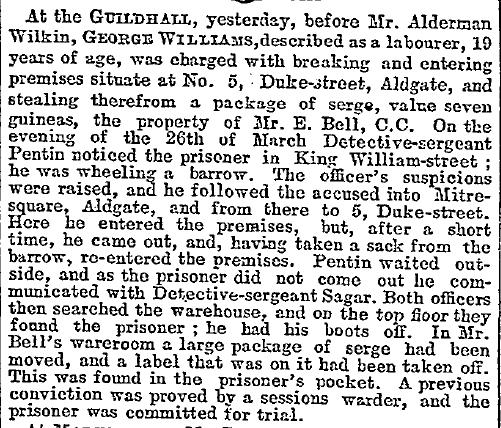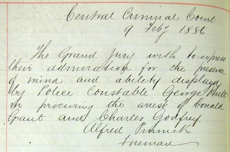 Here is a report of the appearance of the accused in court at the Guildhall, from the Standard of 26 January 1886. Curiously, two men, not one, were involved. Also, no one need be alarmed by Smith's mention of Hutt whistling for assistance - it seems his memory was at fault on that detail.