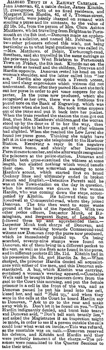 Again, this probably means nothing, but I thought I might as well post it, as it shows that Robert Sagar took a trip to the seaside for some reason in August 1890. It's from the Hampshire Telegraph and Sussex Chronicle of 23 August 1890. I can't see any explanation of why Sagar was in Portsmouth that day, or of why Inspector Monk of Birmingham was there (Monk had previously arrested a woman named Minnie Court of Portsmouth, who was charged with stealing money from a man at Birmingham, but that had been in April [Birmingham Daily Post, 14 April 1890]).