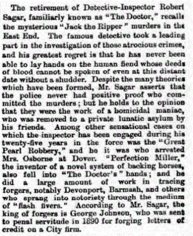 We see, yet again, the perplexity of other reporters that a well-regarded field detective from 1888, in this case Robert Sagar, is being shoved aside by the great Dagonet, the source of his information (Macnaghten of course) unrevealed.