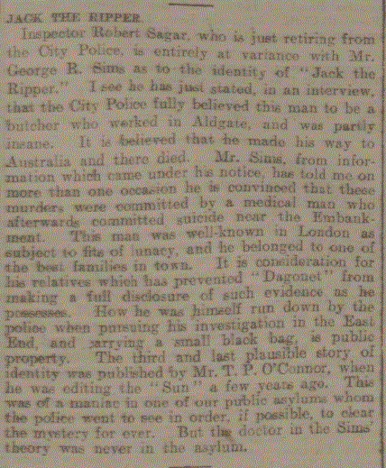 'Mr. Sims, from information which came under his notice, has told me on more than one occasion he is convinced that these murders were committed by a medical man who afterwards committed near the Embankment. This man was well-known in London as subject to fits of lunacy and he belonged to one of the best families in town. It is consideration for his relatives which has prevented "Dagonet" [Sims] from making a full disclosure of such evidence as he possesses. ... But the doctor in Sims' theory was never in the asylum.'
