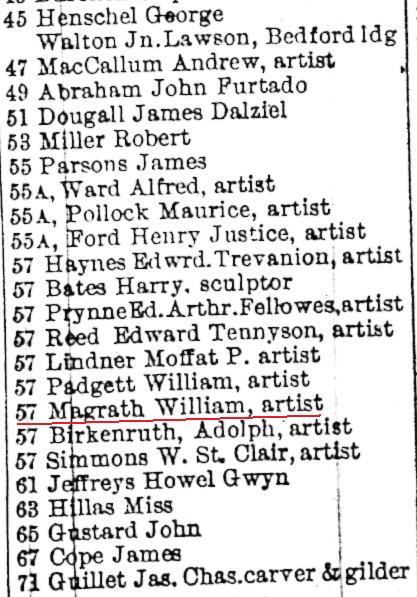 And in view of the excerpt below from the listing for Bedford Gardens, Kensington, in the 1889 Post Office Directory of London - which would have been based on information compiled towards the end of 1888, of course - it's clear that William Magrath the artist was not only in London but at 57 Bedford Gardens in late 1888. I think there can be no reasonable doubt that he is the person referred to in the Special Branch record.