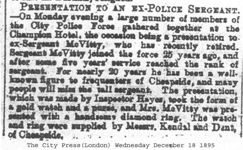 I have found Sgt McvItty in several Old Bailey trials as well as some press extracts. This extract may be of interest. From other sources the 'purse' contained 25 gold sovereigns. Unfortunately the watch and ring were lost during the bombing of Cheapside in WW2. There were also many City Stockbrokers at the presentation as well as policeman. It is interesting that Inspector Hayes is marked out for mention.