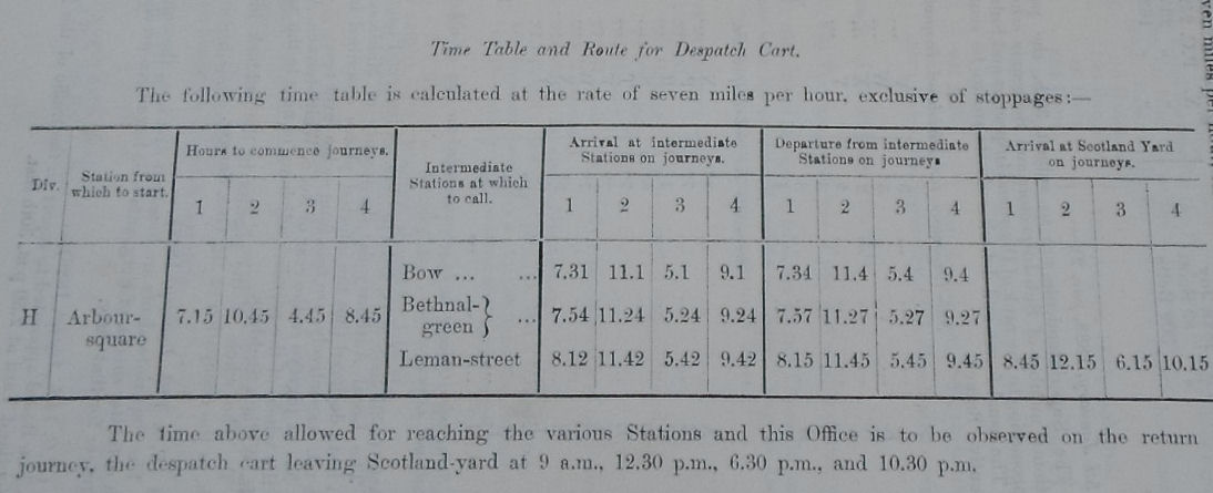 My book, Capturing Jack the Ripper (plug, plug), 'Tecs' chapter, page 103, footnote 27, I refer to a later Police Order dated 20 March 1888, which cited H divisions HQ (Leman St) Despatch Timetable.