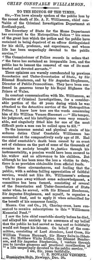 "Practically the appointment has been recognised as the appointment of Mr. Williamson to one of the Chief Constables of the Metropolitan Police, employed in the C.I. Dept. His position as Chief Constable has been officially recognized – and for some time after his appointment he was employed very much to the benefit of the public service as Chief Constable.
